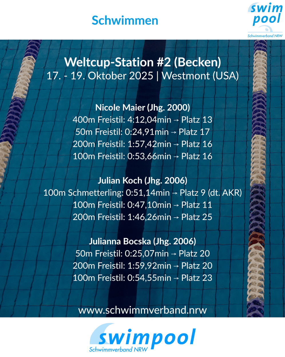 Beim Schwimm-Weltcup im Beckenschwimmen in Westmont (USA), der vom 17. bis zum 19. Oktober 2025 stattfand, nahmen drei Schwimmer*innen der SG Essen teil.