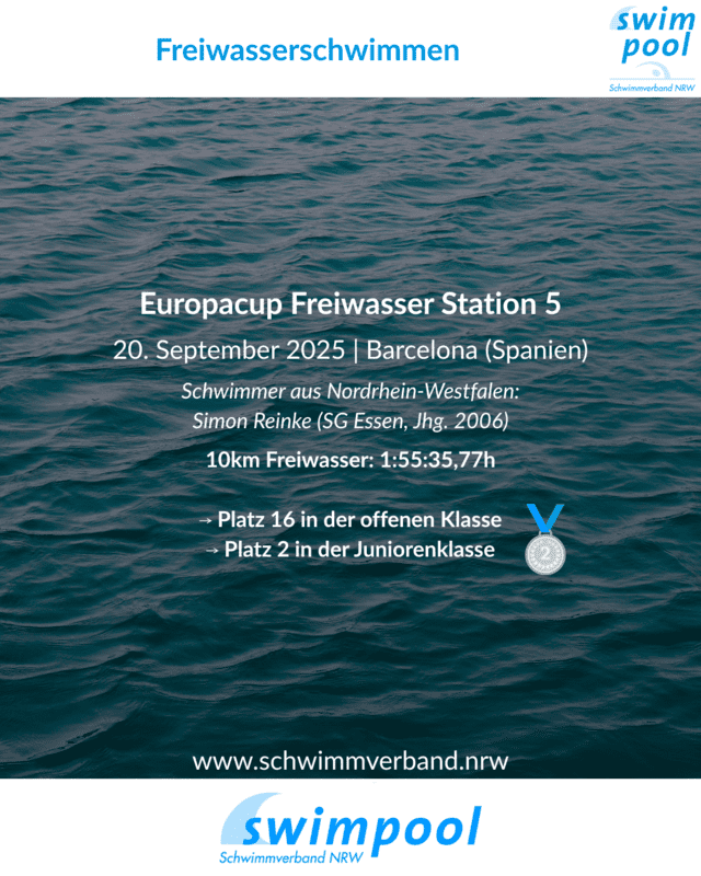 Am 20. September 2025 fand in der spanischen Metropole Barcelona die 5. Station des Freiwasser-Europacups statt. Mit dabei: Simon Reinke (Jhg. 2006) von der SG Essen. Nach 10km schlug er in einer Zeit von 1:55:35,77h an und sicherte sich somit den 16. Platz in der offenen Klasse und die Silbermedaille bei den Junioren.