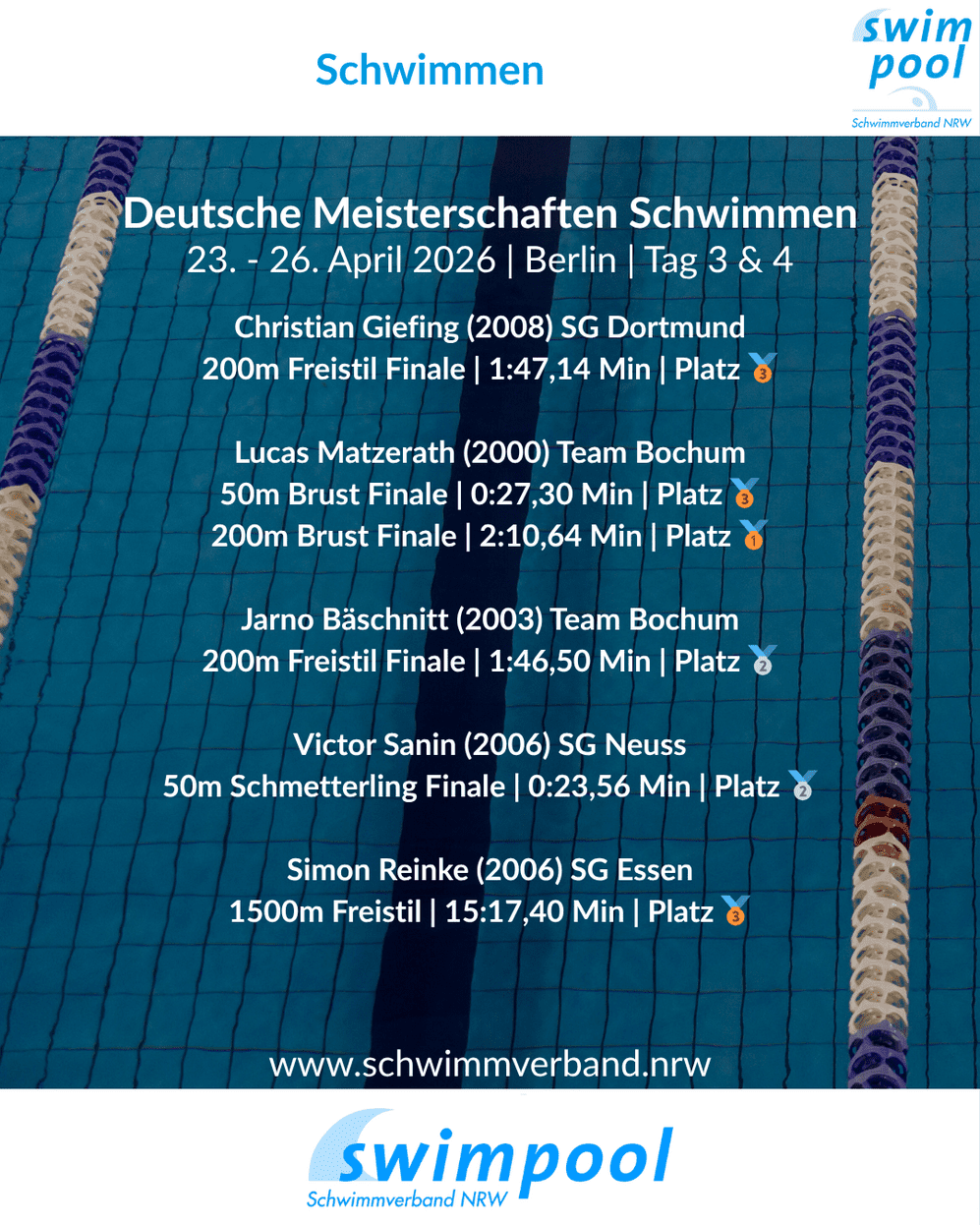 Die Schwimmerinnen und Schwimmer aus Nordrhein‑Westfalen sind mit zahlreichen Medaillen und Finalplatzierungen erfolgreich in die Deutschen Meisterschaften im Schwimmen 2026 (23.–26. April, Berlin) gestartet. Bereits am ersten Wettkampftag überzeugten vor allem Athletinnen und Athleten der SG Essen, der SG Dortmund sowie ein starkes NRW‑Team aus Bochum.