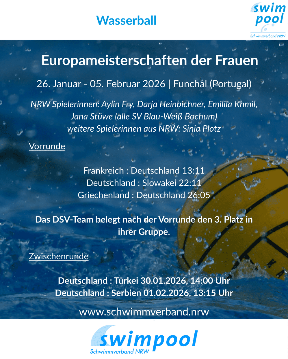- 07./08. Februar 2026: Itze-Gunst-Pokal im Wasserball (Duisburg) - hier trifft die NRW Auswahl auf die Landesgruppen Ost, Süd und Nord