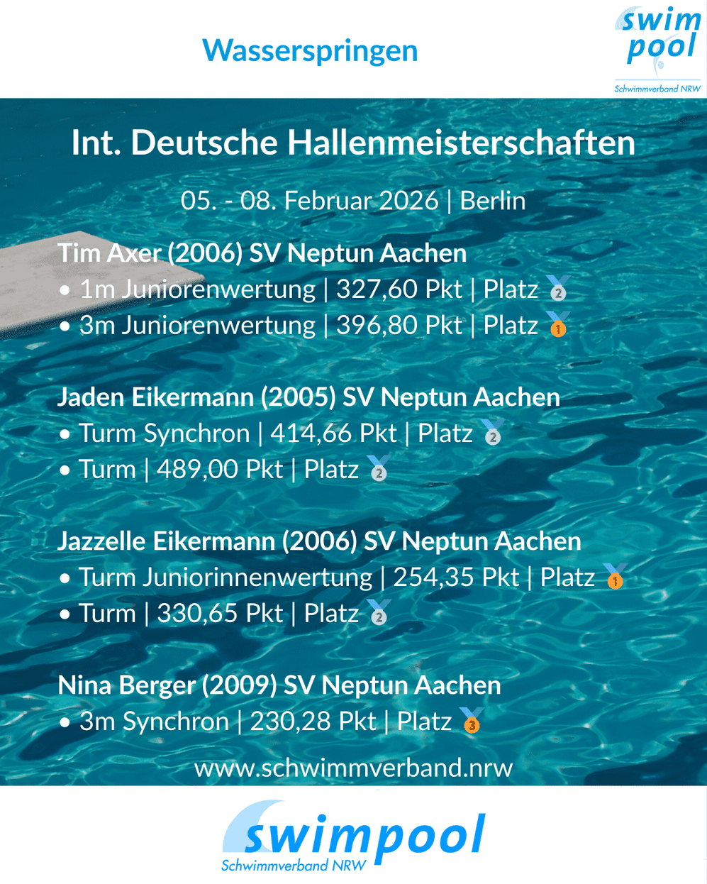 Seit dem 29. Januar finden in Halle die Internationalen Deutschen Hallenmeisterschaften im Wasserspringen der A- und B-Jugend statt. Nina Berger (Jhg. 2009) ersprang vom 1m-Brett mit 396,25 Punkten den Titel. Scarlett Wiens (Jhg. 2010, beide SV Neptun Aachen) sicherte sich mit 325,30 Punkten vom 3m-Brett den dritten Platz. Die Meisterschaften gehen noch bis zum 01. Februar.