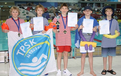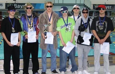 Großartige Stimmung auf den vollbesetzten Tribünen der Wuppertaler Schwimmoper prägten das Bild des SV NRW-Finals des Deutschen Mannschaftswettbewerbes Schwimmen der Jugend (DMSJ). An den zwei Wettkampftagen wurden die Aktiven unablässig angefeuert und so zu besonderen Leistungen getrieben. 85 Mannschaften hatten sich auf Bezirksebene für das Finale in Wuppertal qualifiziert. Geschwommen wurde sowohl bei der weiblichen als auch der männlichen Jugend in vier Altersklassen. In der weiblichen Jugend D (Jahrgänge 2011/2012) waren dreizehn Mannschaften am Start, die männliche Jugend der gleichen Altersklasse war mit vierzehn Teams vertreten. Die Jugend C (Jahrgänge 2009/2010) brachte bei der weiblichen Jugend auf fünfzehn und bei der männlichen Jugend auf dreizehn Mannschaften. Bei der weiblichen Jugend B (Jahrgänge 2007/2008) sahen die Zuschauer sieben und bei der männlichen Jugend acht Mannschaften. Das Teilnehmerfeld der weiblichen Jugend A bestand aus acht und das der männlichen Jugend aus sieben Teams. Das Wettkampfprogramm der DMSJ besteht ausschließlich aus Staffelwettbewerben in allen vier Schwimmarten und einer zusätzlichen Lagenstaffel. Die Addition der einzelnen Staffelzeiten ergibt dann das Endergebnis. Bei der weiblichen Jugend zeigte sich die SG Essen mit drei Titelgewinnen (Jugend D, C und B) als erfolgreichster Verein. Bei der männlichen Jugend gingen in allen Altersklassen die Titel an verschiedene Vereine. Eine Liste mit den Gesamtergebnissen aller Altersklassen ist diesem Bericht beigefügt. Höhepunkt der Veranstaltung war einmal mehr die Siegerehrung. Hier erschienenen wie in jedem Jahr die Teams wieder in fantasievollen Kostümen. Es ist immer wieder schön anzusehen, wie viel Mühe sich die Aktiven der Vereine beim Aussuchen ihrer Verkleidungen machen.