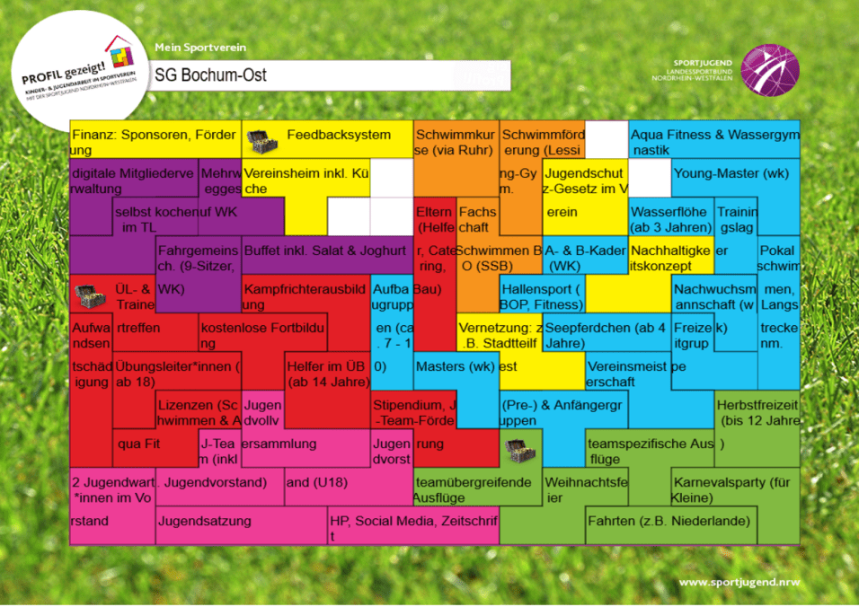 Michelle, Matthias, Nele, Pia und Marie der SG Bochum-Ost haben ihre Profilierung online via Zoom durchgeführt. Damit trotzdem ein "Plakat" entstehen konnte, wurde die digitale Version von "Zeig dein Profil" der Sportjugend NRW genutzt. Besonders wichtig sind ihnen die teamübergreifenden Ausflüge, die regelmäßigen Übungsleiter*innen- und Trainer*innentreffen, sowie das bestehende J-Team, zu dem auch der Jugendvorstand gehört. Die gelben Weiterentwicklungsbausteine, die sie als erstes angehen wollen, sind der Aufbau eines umfassenden Feedbacksystems, die Umsetzung des Jugendschutzgesetzes im Verein, sowie die Suche nach einem geeigneten Vereinsheim inkl. Küche.
