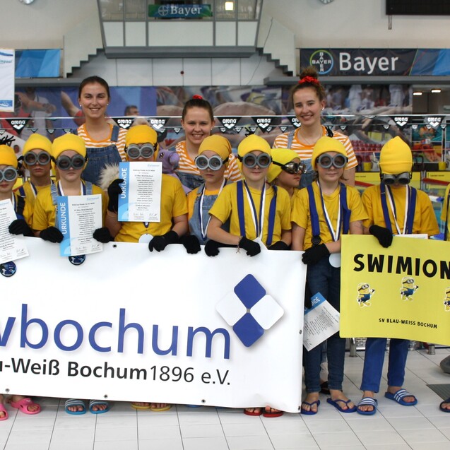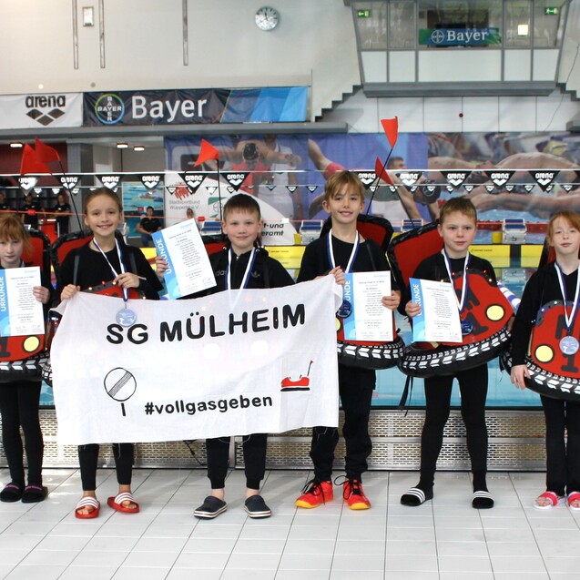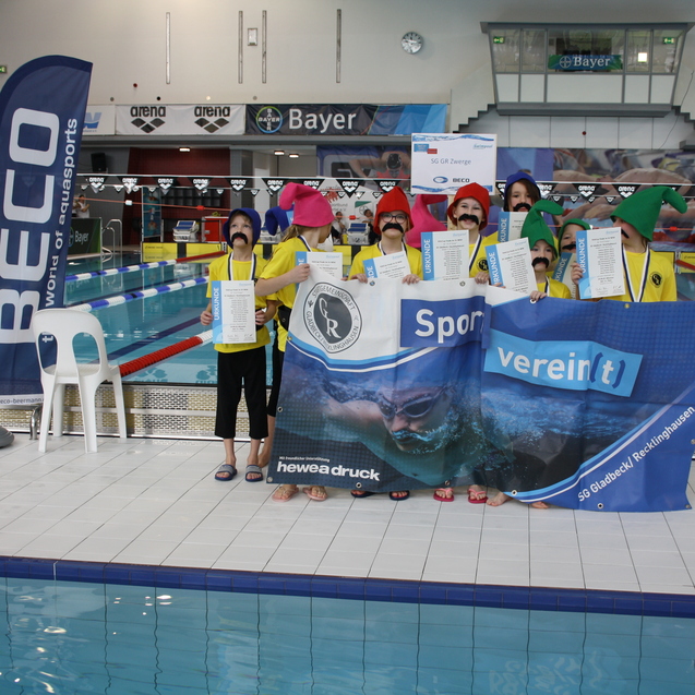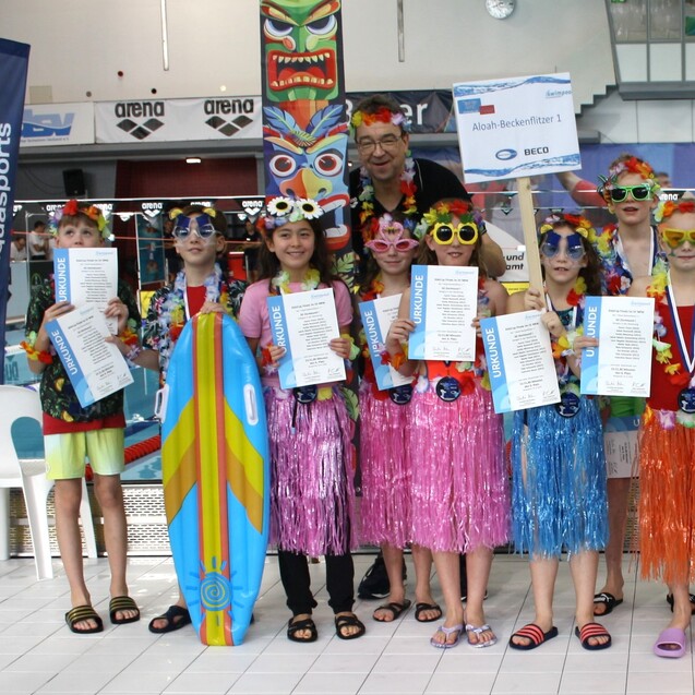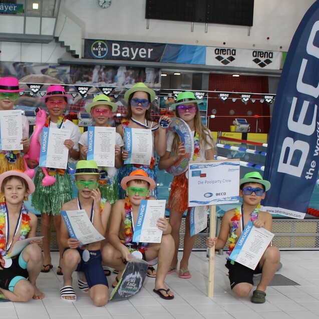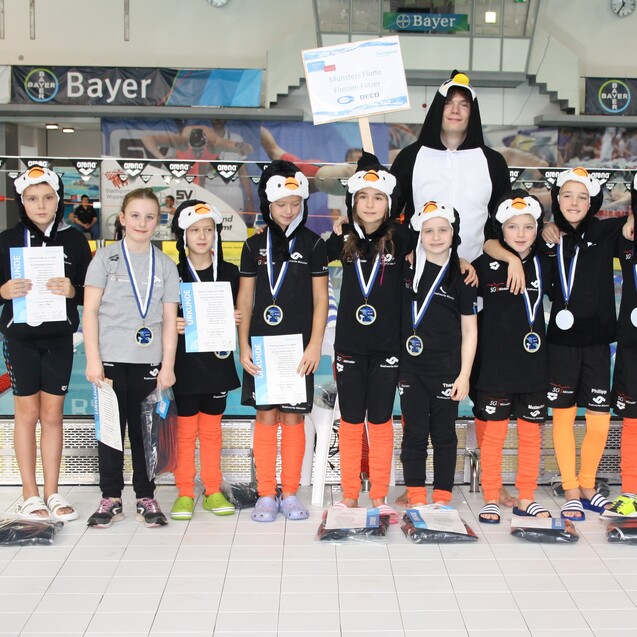 Die jungen Aktiven hatten in der Schwimmoper sichtlich viel Spaß an der Veranstaltung und legten sich nochmals mächtig ins Zeug. Natürlich gab es am Ende auch eine Siegerteam, das war die SG Schwimmen Münster, die unter ihrem „Künstlernamen“ Münsters Flotte Flossen Flitzer mit einer Gesamtzeit von 21:41,62 Minuten den Wettbewerb für sich entschied. Auf Platz zwei landete die Poolparty Crew der SG Bayer mit einer Gesamtzeit von 22:06,09 Minuten. Rang drei belegten die Pinken Panther der SG Essen mit einer Zeit von 22:10,73 Minuten.