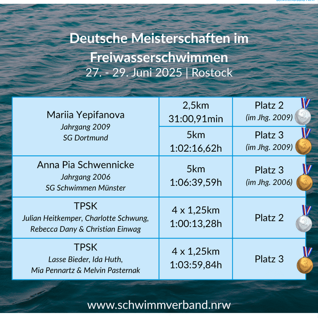 Vom 07. bis zum 09. Juni 2025 fand in Dortmund der Deutsche Schwimmerische Mehrkampf statt. Die Schwimmer*innen aus Nordrhein-Westfalen erschwammen sich insgesamt 8 Medaillen - jeweils 3 goldene und silberne, sowie 2 bronzene.