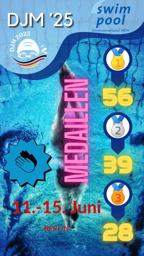 Vom 11. bis zum 15. Juni 2025 fanden im Europasportpark in Berlin die Deutschen Jahrgangsmeisterschaften im Schwimmen statt. Die Schwimmer*innen aus Nordrhein-Westfalen holten insgesamt 123 Medaillen mit nach Hause - nur eine weniger als im Rekordjahr 2023.