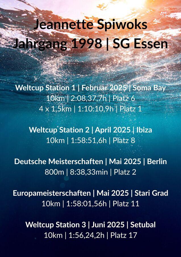 Vom 28. bis zum 31. Mai 2025 fanden im kroatischen Stari Grad die Europameisterschaften im Freiwasserschwimmen statt. Jeannette Spiwoks von der SG Essen erschwamm sich über die 10km den 11. Platz. Jeannette benötigte für die 10km gerade einmal 1:58:01,56h. Wir gratulieren erneut recht herzlich zu dieser herausragenden Leistung und ziehen die Badekappe vor dieser Konstanz!