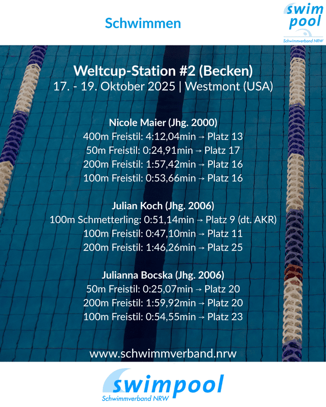 Beim Schwimm-Weltcup im Beckenschwimmen in Westmont (USA), der vom 17. bis zum 19. Oktober 2025 stattfand, nahmen drei Schwimmer*innen der SG Essen teil.