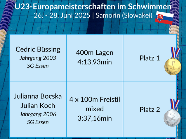 Cedric Büssing (Jhg. 2003) von der SG Essen holt Gold über die 400m Lagen in einer Zeit von 4:13,93min. Julianna Bocska und Julian Koch (beide Jhg. 2006, SG Essen) dürfen sich gemeinsam mit der 4 x 100m Freistil mixed Staffel in einer Zeit von 3:27,16min über die Silbermedaille freuen.