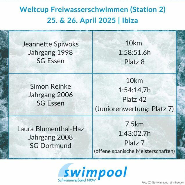 Am 25. und 26. April wurde auf der spanischen Insel Ibiza die 2. Station des Freiwasser-Weltcups ausgetragen. Jeannette Spiwoks (Jhg. 1998, SG Essen) belegte über die 10km in einer Zeit von 1:58:51,6h den 8. Platz. Ihr Vereinskollege Simon Reinke (Jhg. 2006) erschwamm sich auf dieser Strecke in einer Zeit von 1:54:14,7h den 42 Platz und belegte in der Juniorenwertung den 7. Platz.