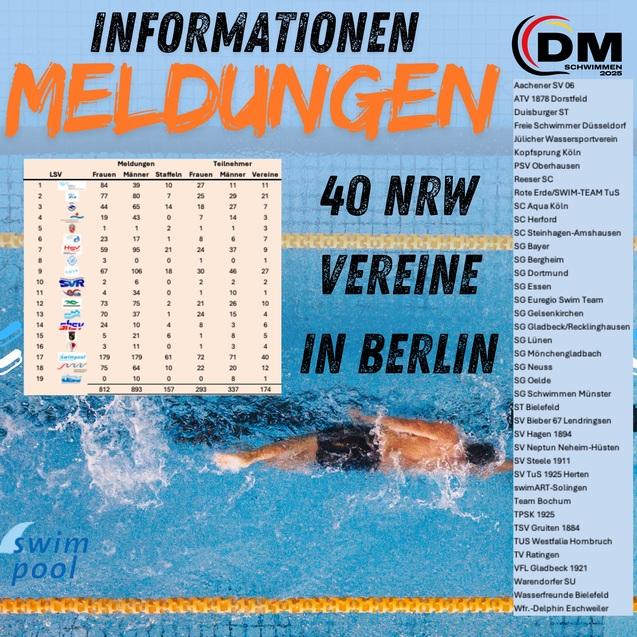 Vom 01. bis zum 04. Mai finden in Berlin die Deutschen Meisterschaften im Schwimmen statt. Aus NRW sind insgesamt 40 Vereine dabei.