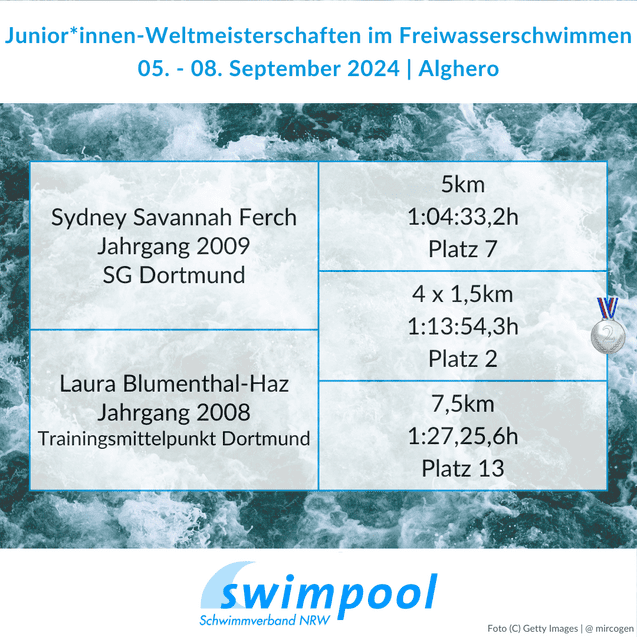 Vom 05. - 08. September fanden im italienischen Alghero die Junior*innen-Weltmeisterschaften im Freiwasserschwimmen statt. Sydney Savannah Ferch von der SG Dortmund und Laura Blumenthal-Haz, die ihren Trainingsmittelpunkt ebenfalls in Dortmund hat, konnten sich mit der 4 x 1,5km-Staffel den Vizeweltmeistertitel sichern!