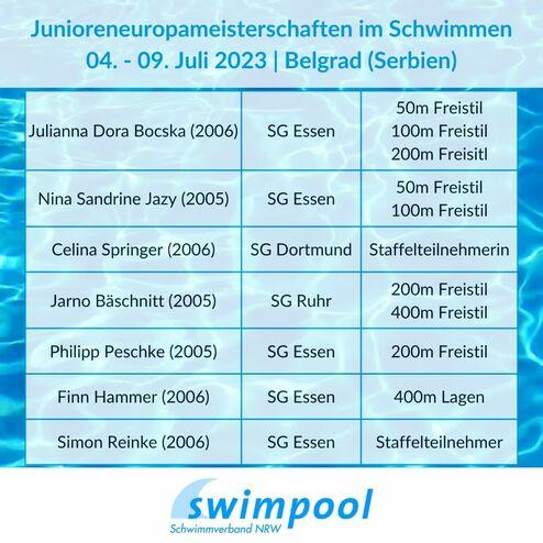 Der Deutsche Schwimm-Verband hat die Nominierungen für die Junioreneuropameisterschaft und für die U23-Europmaeisterschaft im Schwimmen veröffentlicht. Aus Nordrhein-Westfalen sind folgende Schwimmer*innen dabei: