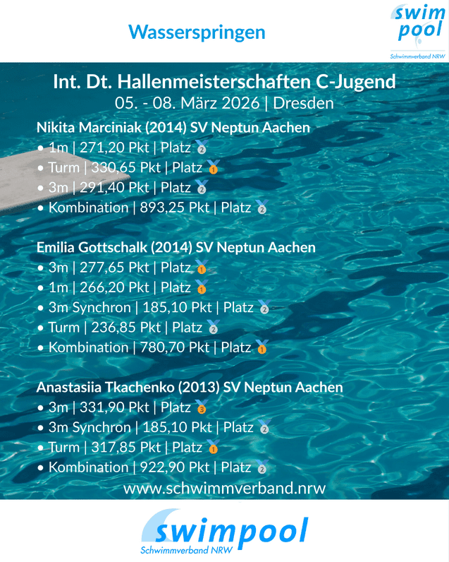 Vom 05. bis 08. März 2026 fanden in Dresden die Internationalen Deutschen Hallenmeisterschaften der C‑Jugend im Wasserspringen statt. Die jungen Talente des SV Neptun Aachen präsentierten sich in starker Form und sicherten sich zahlreiche Medaillen in den Disziplinen 1‑Meter‑Brett, 3‑Meter‑Brett, Turm und Kombination.