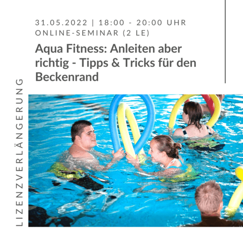 - 31.05.2022 | 18:00-20:00 Uhr | Online-Seminar (2 LE): Auqa Fitness: Anleiten aber richtig - Tipps & Tricks für den Beckenrand