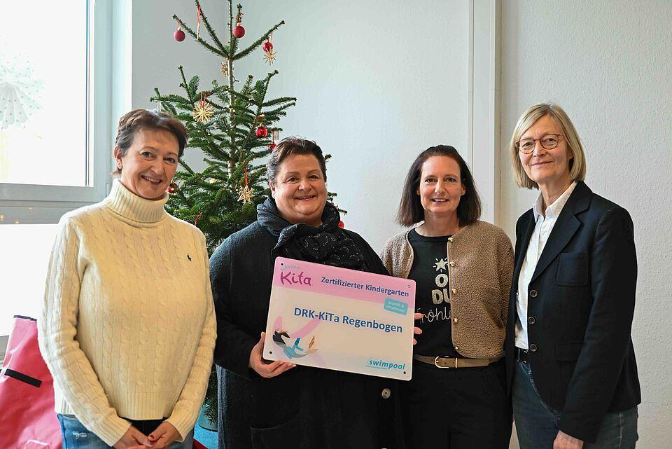 Am Samstag, dem 22. November 2025 wurde die DRK-Kita "Regenbogen" in Ibbenbüren als Schwimm-Kita ausgezeichnet. Vom Schwimmverband NRW vor Ort waren Julia Abraham, Fachkraft für den Ganztag, und Elke Struwe, Vizepräsidentin Bildung, um das Zertifikat und die Plakette zu überreichen.