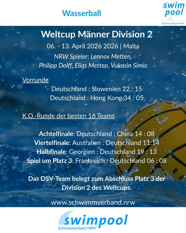 Beim Wasserball-Weltcup der Männer in der Division 2 auf Malta (06.–13. April 2026) präsentierte sich die deutsche Nationalmannschaft in starker Form und beendete das Turnier auf einem hervorragenden 3. Platz.