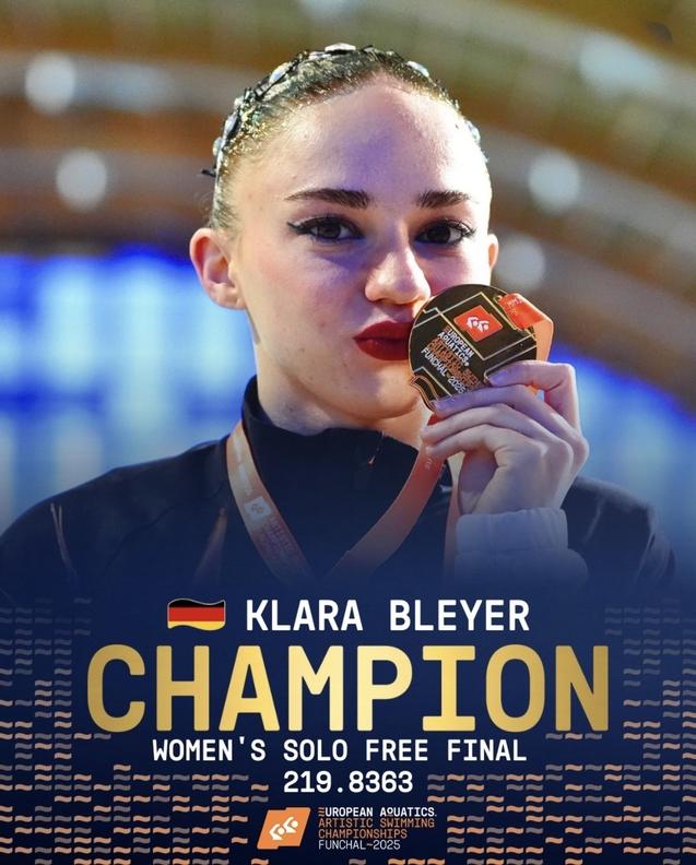 Mit 219,8363 Punkten hat Klara Bleyer von den Freien Schwimmern Bochum am Vormittag des 03. Juni 2025 das Solo Free Finale der Frauen für sich entschieden. Sie ließ u.a. Enrica Piccolo mit 212,9451 Punkten aus Italien und Iris Tio Casas mit 208,9075 Punkten aus Spanien hinter sich. Ein historisches Ergebnis für den deutschen Schwimmsport.