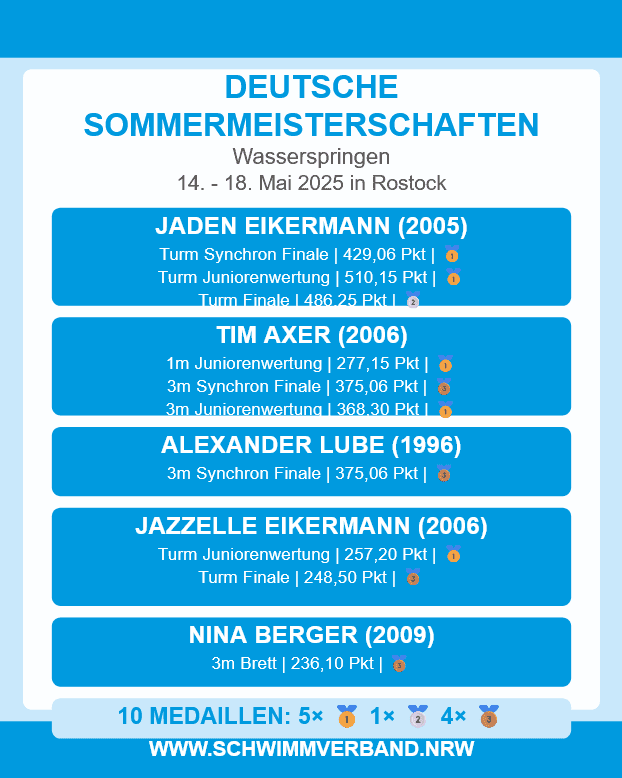Die Wasserspringer*innen des SV Neptun Aachen überzeugen bei den Deutschen Sommermeisterschaften im Wasserspringen (14.-18. Mai 2025 in Rostock) auf ganzer Linie. Mit fünf Gold-, einer Silber- und vier Bronzemedaillen stellt der Verein seine Ausnahmestellung unter Beweis.