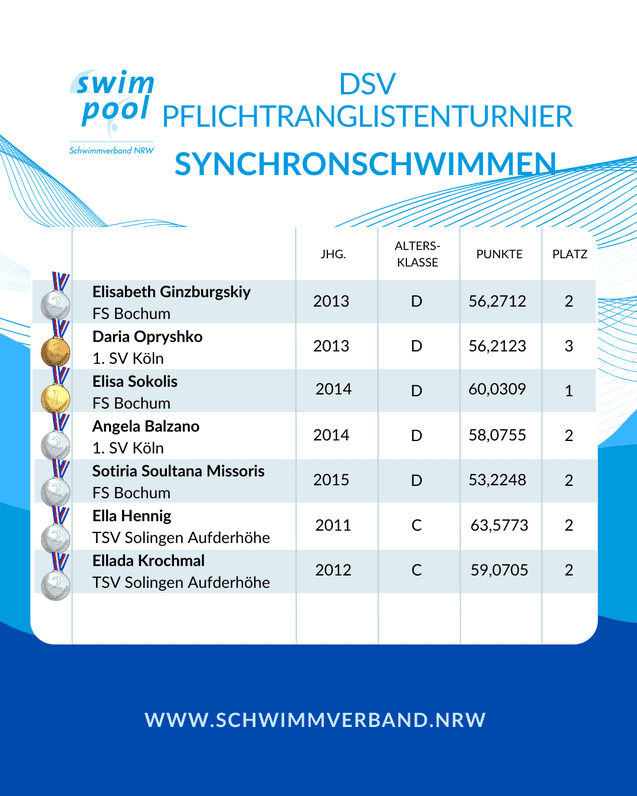 Am 15. und 16. Februar 2025 fand im sächsischen Zwickau das DSV Pflichtranglistenturnier im Synchronschwimmen statt. Die Sportlerinnen aus NRW holten insgesamt 7 Medaillen - mehr als alle anderen Bundesländer!
