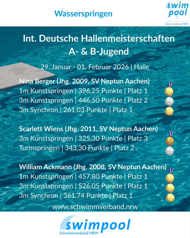 Die internationalen deutschen Hallenmeisterschaften im Wasserspringen fanden vom 05. bis zum 08. Februar 2026 in Berlin statt. Die Springer*innen vom SV Neptun Aachen fischten insgesamt sieben Medaillen aus dem Wasser. Nachdem Nina Berger schon bei den Meisterschaften der A- & B-Jugend erfolgreich war, glänzte sie nun auch in der offenen Klasse. Wir gratulieren allen vier Athlet*innen zu diesen hervorragenden Leistungen!