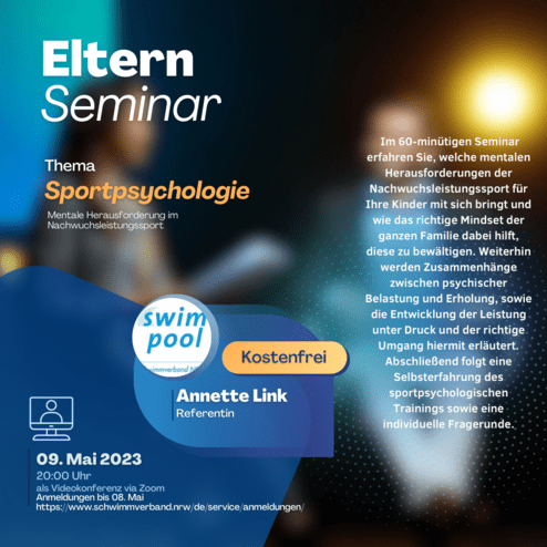 Am 09. Mai von 20:00 - 21:00 Uhr findet ein Online-Seminar zum Thema Sportpsychologie statt. Eingeladen sind alle Eltern und Familienangehörige, dessen Kinder Leistungssport betreiben (Fokus: Schwimmen).