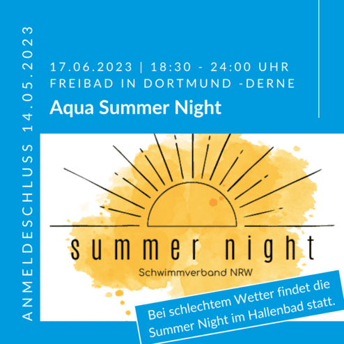 Die Summer Night findet am 17.06.2023 von 18:30 - 24:00 Uhr im Freibad in Dortmund-Derne statt. Alle Interessierten können sich noch bis zum 14.05.2023 anmelden. Sollte an dem Abend schlechtes Wetter sein, findet die Summer Night im Hallenbad statt.