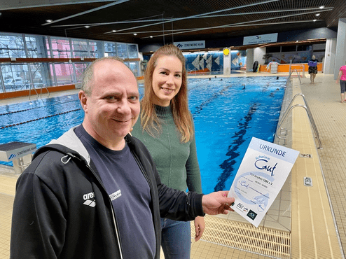 Die Urkunde, sowie der Bildungsgutschein wurden von Sonja Riedenbach (Schwimmverband NRW, NRW bewegt seine Kinder) an Vadim Tsypkin übergeben. Der Schwimmverband NRW gratuliert dem TSV Gruiten 1884 recht herzlich zur erneuten Zertifizierung und freut sich, dass dort qualitativ hochwertiger Schwimmunterricht angeboten wird.