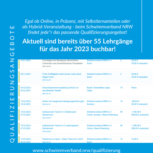 Plane jetzt deine Aus- oder Weiterbildung 2023! Aktuell findest du auf unserer Qualifizierungsübersicht über 55 Lehrgänge, für die du dich jetzt schon anmelden kannst.