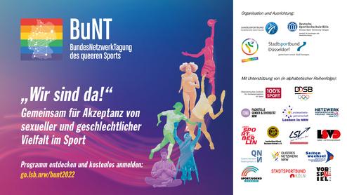 Vom 31.10. - 06.11.2022 findet die BundesNetzwerkTagung des queeren Sports (BuNT) in NRW statt. Interessierte können sich noch bis zum 28.10.2022 für das vielfältige Programm anmelden. Die Tagung findet sowohl in Präsenz in Köln als auch online statt, sodass jede*r die Möglichkeit, teilzunehmen.