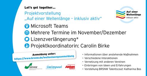 Der Behinderten- und Rehabilitationssportverband NRW (BRSNW) und der Schwimmverband NRW wollen mit dem Projekt "Auf einer Wellenlänge - inklusiv aktiv" Menschen mit und ohne Behinderung zum Schwimmen bringen. Kostenfreie Online-Seminare sollen die Teilnehmer*innen über das Projekt informieren und über das Thema Inklusion in Schwimmvereinen aufklären.