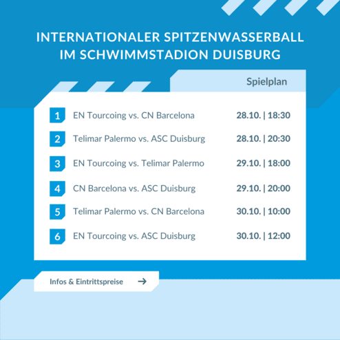 Der ASC Duisburg hat vom 28. - 30.10.2022 internationale Spitzenteams zu Gast. Die Wasserballspiele auf höchstem Niveau finden im Schwimmstadion in Duisburg statt.