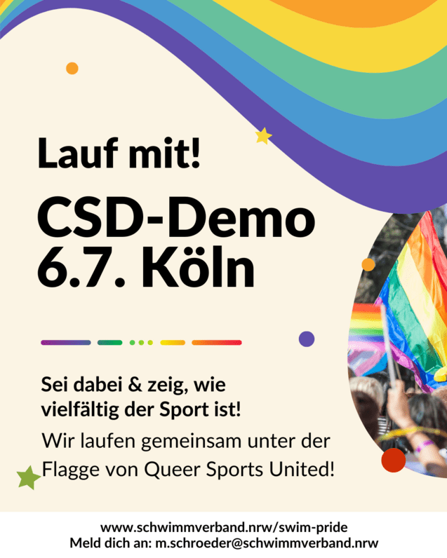 Am 06. Juli 2025 findet in Köln die CSD-Demo statt - und der Schwimmverband NRW ist dabei! Gemeinsam mit dem Landessportbund NRW, zahlreichen Sportverbänden und -vereinen laufen wir unter der Flagge von Queer Sports United (ehemals Regenbogensport) beim CSD in Köln mit und demonstrieren für mehr Vielfalt.