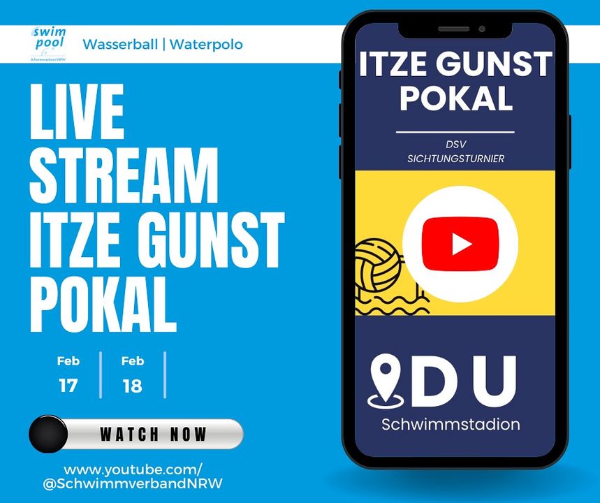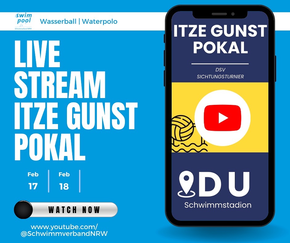 Am 17. und 18. Februar findet der Itze Gunst Pokal im Schwimmstadion in Duisburg statt. Bei diesem Wasserball-Turnier 🤽🏻♂️🤽🏾♂️ messen sich die männlichen U16-Mannschaften aus den vier Landesgruppen Nord, Ost, Süd und West (Schwimmverband NRW).