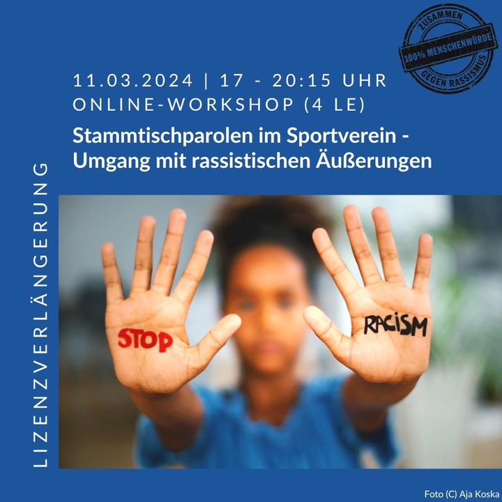 1️⃣ 11.03.2024 | 17:00 - 20:15 Uhr: „Stammtischparolen im Sportverein - Umgang mit rassistischen Äußerungen“ (online)