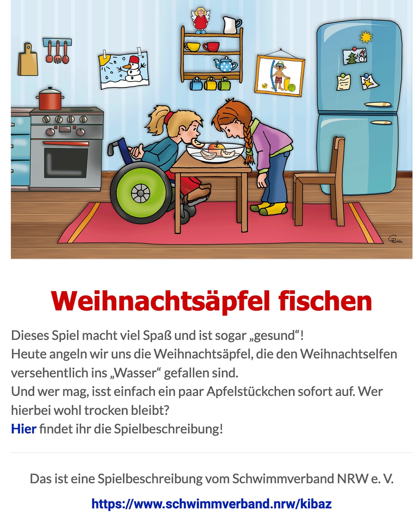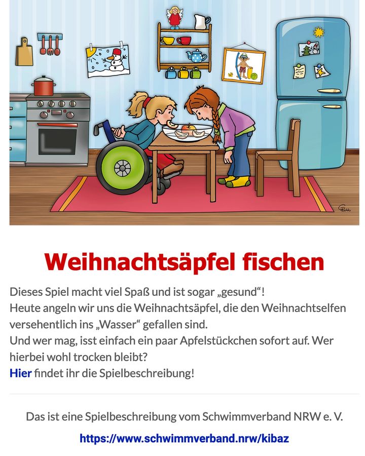 Es lohnt sich auf jeden Fall, morgen mal vorbeizuschauen - denn dann ist die erste Spielidee des Schwimmverbandes NRW hinter dem achten Türchen versteckt. Damit ihr für das Türchen morgen perfekt ausgerüstet seid, benötigt ihr Äpfel und eine große Schüssel oder einen Eimer voll Wasser!