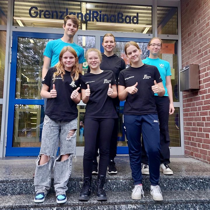 Ein Montag im August, die Sonne scheint, nebenan klingeln die Schulglocken. Vor dem GrenzlandRing Bad Wegberg sammelt sich eine Trainingsgruppe. Es sind die Freien Schwimmer Wegberg. Zu ihnen gehören auch Wibke, Linna, Lisa, Sophie, Svea, Niklas und Lia. Sie bilden das J-Team des Schwimmvereins und erhalten heute ihr Starterpaket. Zu der Übergabe sind der 1. Vorsitzende des KreisSportBundes Heinsberg @kreissportbund_heinsberg , Jürgen Meuser, und die Fachkraft für die Jugendarbeit des Schwimmverbandes NRW, Ulrike Volkenandt, angereist.