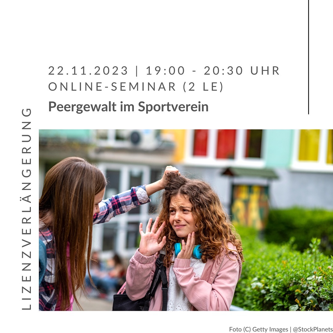 Am 22. November 2023 findet in der Zeit von 19:00 - 20:30 Uhr das Online-Seminar "Peergewalt im Sportverein" statt. Das Seminar wird mit zwei Lerneinheiten (2 LE) für die Verlängerung zahlreicher Zertifikate und Lizenzen des Schwimmverbandes NRW anerkannt.