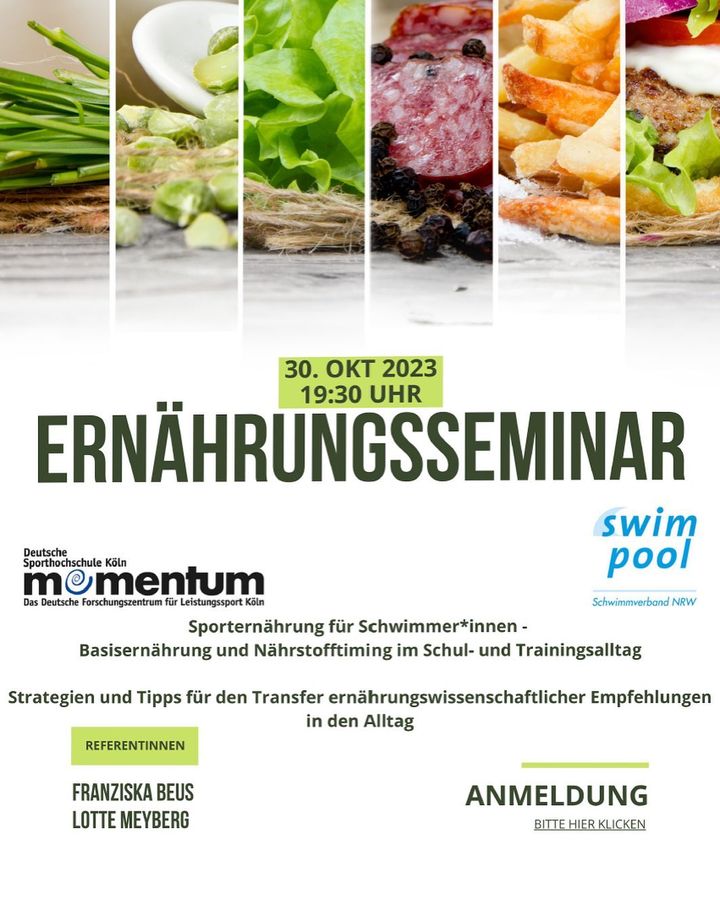 Am 30.10.2023 findet ab 19:30 Uhr ein kostenfreies Online-Seminar zum Thema "Sporternährung bei Schwimmer*innen - Basisernährung und Nährstofftiming im Schul- und Trainingsalltag" für Eltern, Trainer*innen und alle Interessierten statt. 🥗