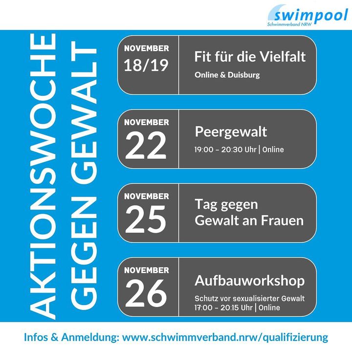 Zwei neue Lehrgänge, die auch für die Verlängerung von zahlreichen Lizenzen und Zertifikaten anerkannt werden, runden die Aktionswoche gegen Gewalt ab. Am 22. November findet von 19:00 - 20:30 Uhr das Online-Seminar "Peergewalt im Sportverein" statt. Hier geht es u.a. um die Arten, die Ursachen, die Entstehung, die Symptome, die Vorbeugung und die Auswirkungen von Peergewalt. 🤜🤛