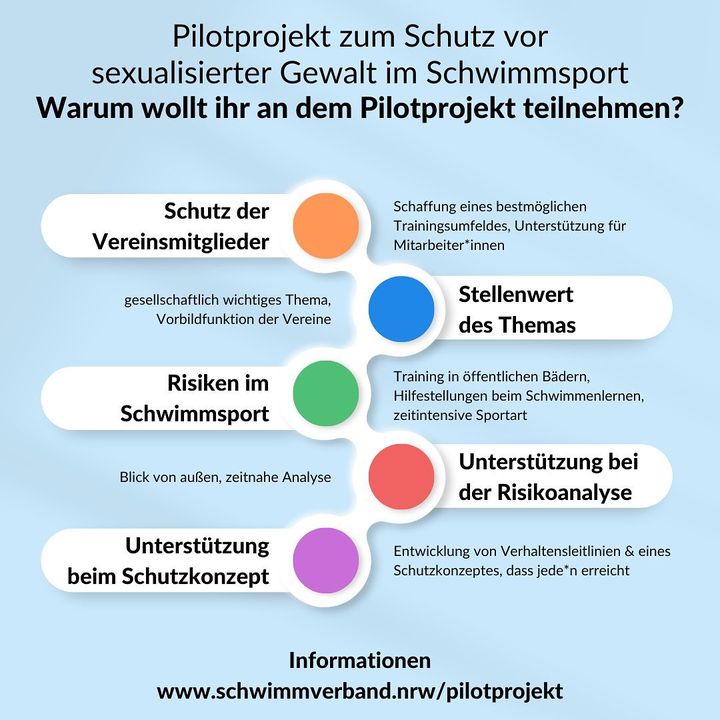 Für die Teilnahme am Pilotprojekt hatten sich insgesamt 21 schwimmsporttreibende Abteilungen und Vereine aus ganz NRW beworben. Bei der Bewerbung haben die Schwimmvereine und -abteilungen u.a. angegeben, warum sie am Pilotprojekt teilnehmen wollen und welche Bedarfe sie hinsichtlich des Schutzes vor sexualisierter Gewalt sehen.