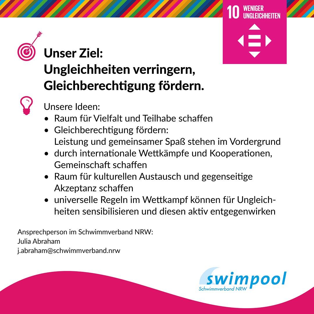 "Weniger Ungleichheiten" lautet das 10. der UN-Nachhaltigkeitsziele. Der Schwimmverband NRW möchte mit Hilfe der Vereine Ungleichheiten verringern und Gleichberechtigung fördern. Wie kann das aussehen? 👀