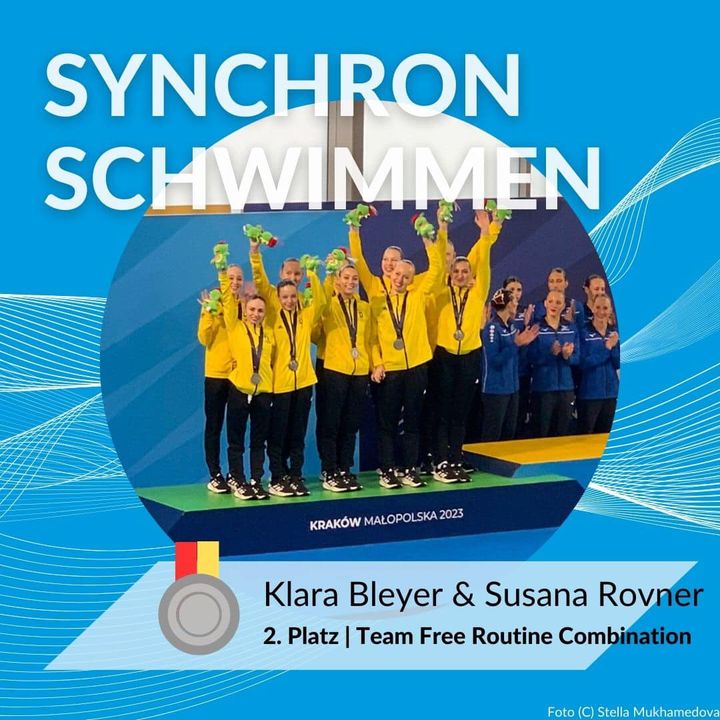 Klara Bleyer und Susana Rovner von den Freien Schwimmern Bochum 1919 e.V. sicherten sich am 23.06.2023 im Finale der Team Free Routine Combination gemeinsam mit dem DSV-Team die Silbermedaille bei den European Games in Polen. Es ist die erste Medaille für den Deutschen Schwimmverband seit 40 Jahren im Synchronschwimmen bei einer Europameisterschaft. Aktuell starten beide bei der Weltmeisterschaft in Japan. @klarableyer@susana_rov@synchrosfsb@ger.synchro@stellamukhamedova
