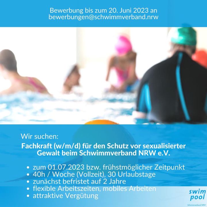 Wir, der Schwimmverband NRW, suchen zum 01.07.2023 bzw. frühestmöglichen Zeitpunkt in Vollzeit (40h) eine Fachkraft (w/m/d) für den Schutz vor sexualisierter Gewalt beim Schwimmverband NRW e.V.