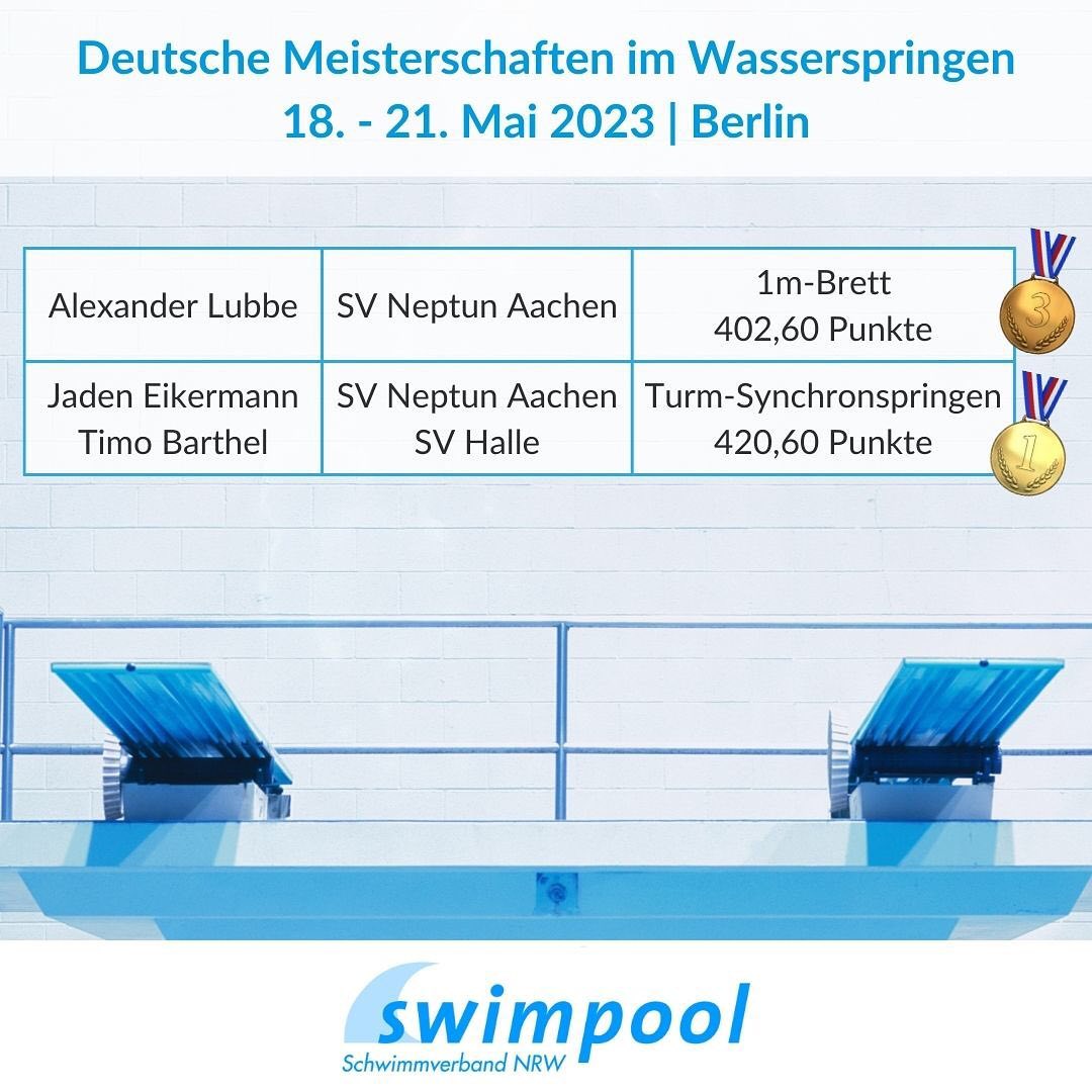 Vom 18. - 21. Mai 2023 fanden in Berlin die Deutschen Sommermeisterschaften im Wasserspringen statt. Jaden Eikermann, Alexander Lube und Christian Bilk vom SV Neptun Aachen holten insgesamt sieben Medaillen für NRW nach Hause.