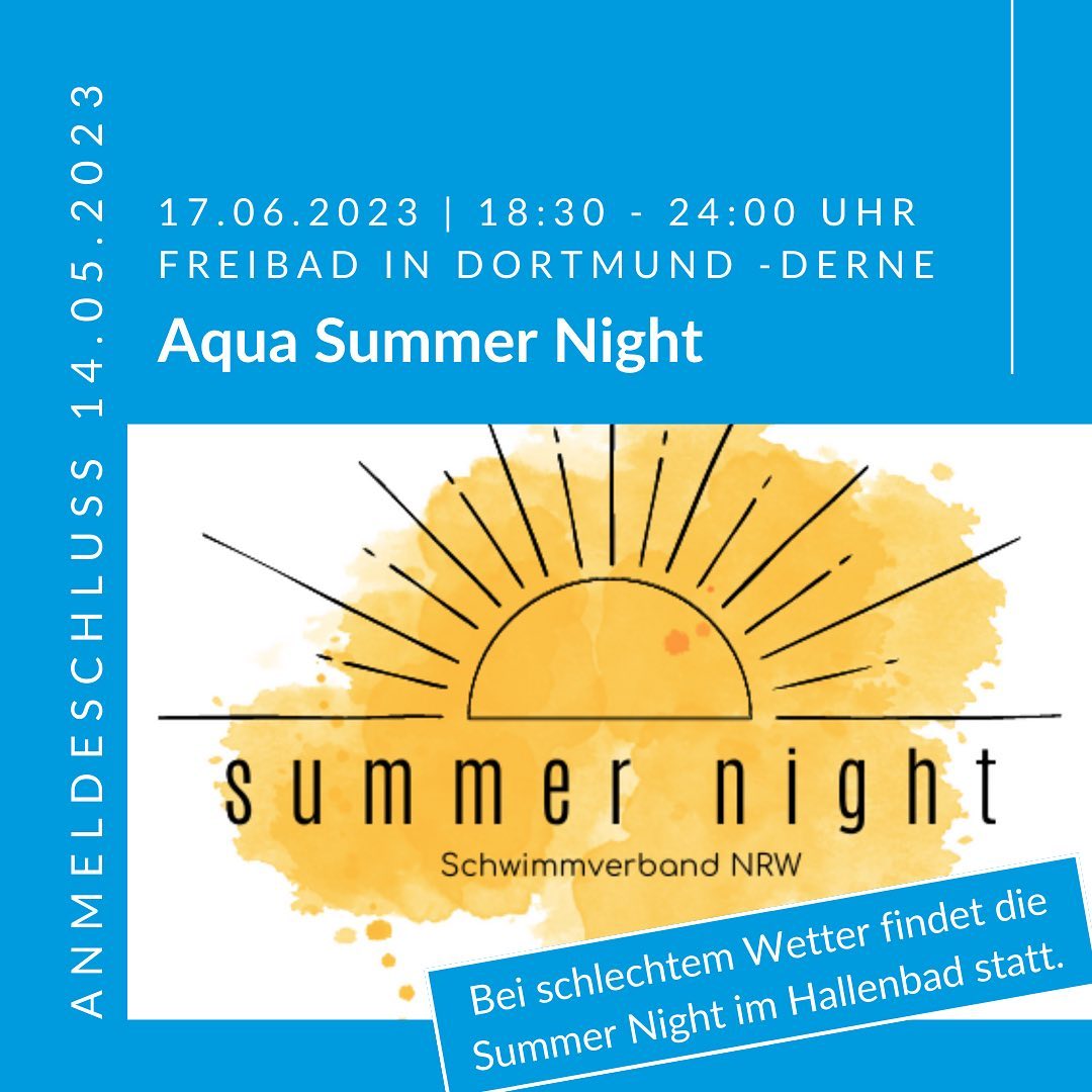 Die Summer Night findet am 17.06.2023 von 18:30 - 24:00 Uhr im Freibad in Dortmund-Derne statt. Alle Interessierten können sich noch bis zum 14.05.2023 anmelden. Sollte an dem Abend schlechtes Wetter sein, findet die Summer Night im Hallenbad statt. ✅