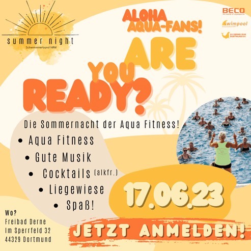Am 17.06.2023 findet von 18:30 - 24:00 Uhr die erste Summer Night des Schwimmverbandes NRW statt! Im Freibad in 📍Dortmund Derne erwarten euch vielfältige Aqua Fitness Workouts, tolle Musik und ein sommerliches Gesamtpaket inkl. alkoholfreier Cocktails. 🍸