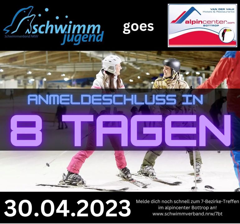 Melde dich noch bis zum 20.04.2023 für das 7-Bezirke-Treffen der Schwimmjugend NRW im alpincenter Bottrop an! ⛷️