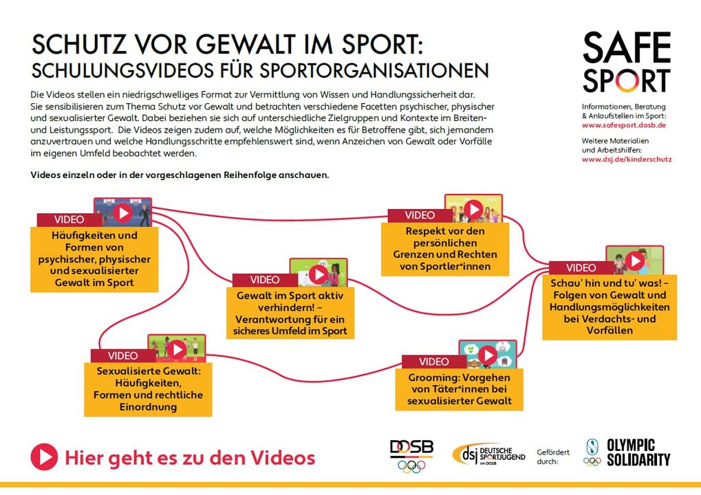 Die Deutsche Sportjugend dsj und der Deutsche Olympische Sportbund (Sportdeutschland) haben zusammen mit der SchirrmacherGroup sechs Sensibilisierungs- und Schulungsvideos entwickelt. Sie sensibilisieren für das Thema Schutz vor Gewalt im Sport und betrachten verschiedene Facetten psychischer, physischer und sexualisierter Gewalt. Dabei beziehen sie sich auf unterschiedliche Zielgruppen und Kontexte im Breiten- und Leistungssport. Es wird auch auf die Auswirkungen und Folgen von Gewalterfahrungen auf eine Person aufmerksam gemacht.