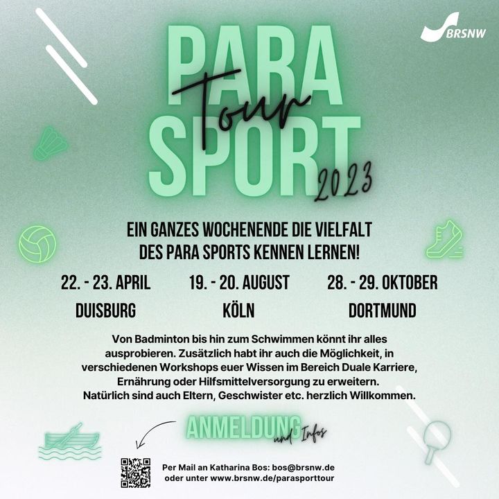 Ihr habt Lust, ein ganzes Wochenende die Vielfalt des Para Sports kennen zu lernen? Von Badminton bis hin zum Schwimmen könnt ihr alles ausprobieren. Zusätzlich habt ihr auch die Möglichkeit, in verschiedenen Workshops euer Wissen im Bereich Duale Karriere, Ernährung 🥘 oder Hilfsmittelversorgung zu erweitern. Natürlich sind auch Eltern, Geschwister etc. herzlich Willkommen. (Beim Schwimmen gibt es auch bei jedem Termin die Möglichkeit, sich in der Anfängergruppe auszuprobieren.)